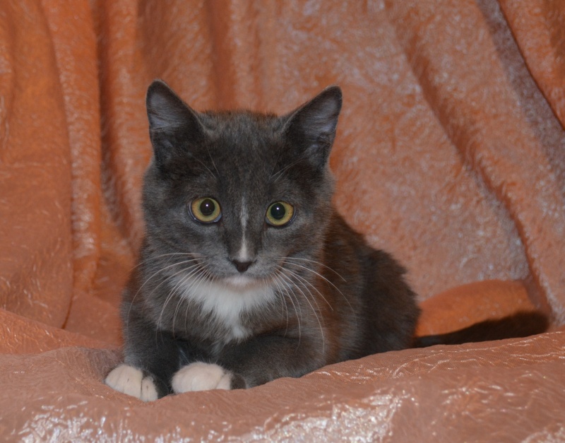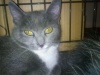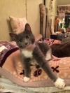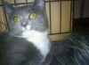 Глазки зелёные, лапочки в белых варежках, грудка белая, сама дымчатая