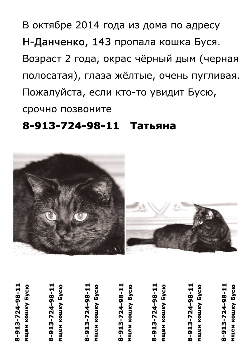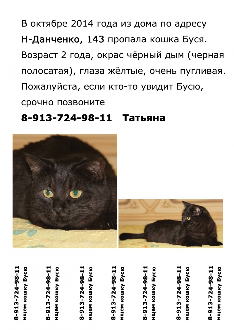 Пошли звонки, было уже 3. Кошку, очень похожую на Бусю видят в одном и том же месте, в округе дома Ватутина 49/1.