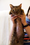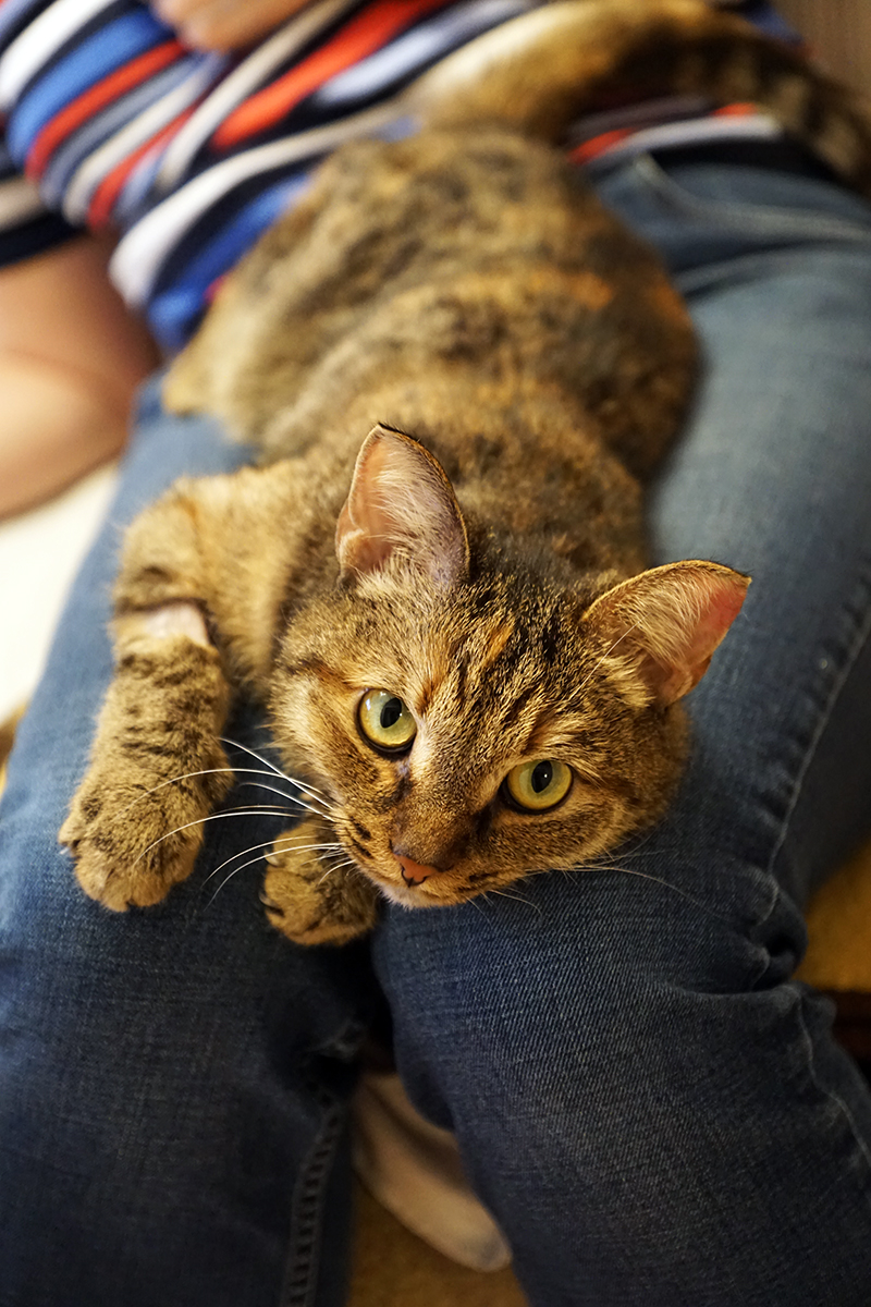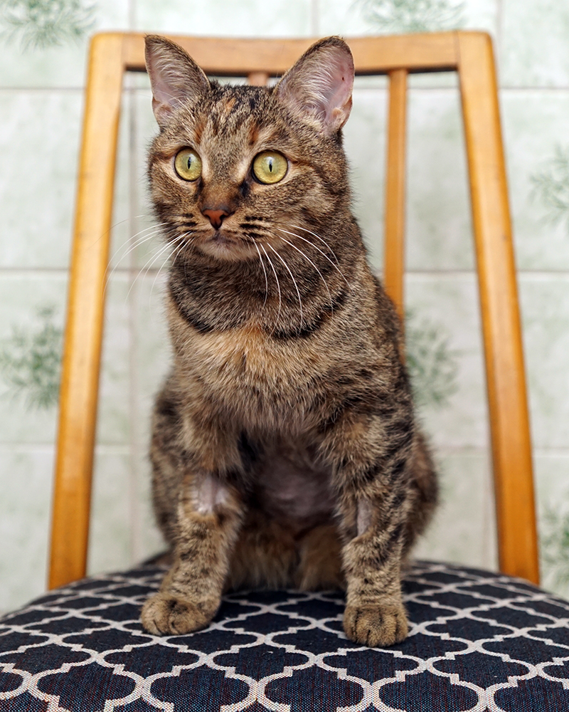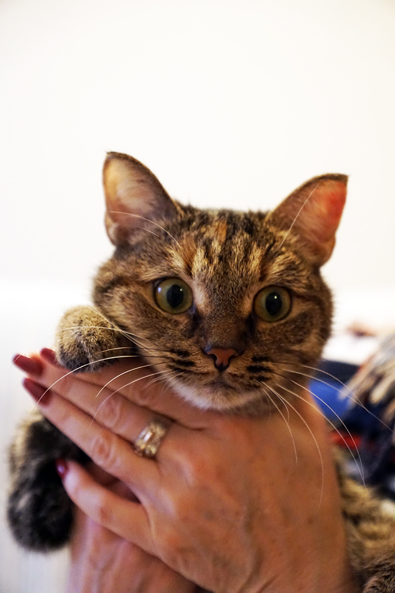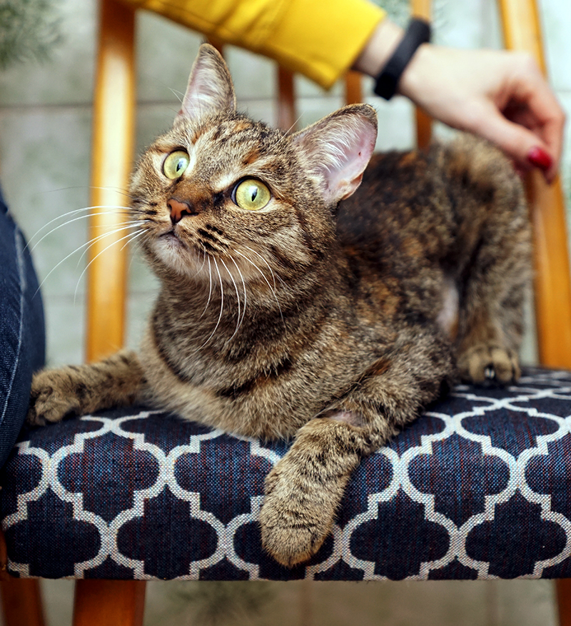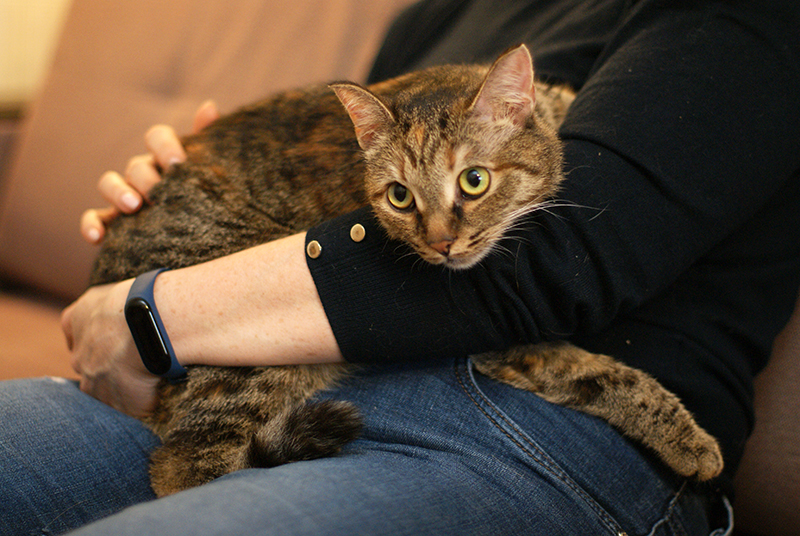Оля, дышит нормально. На передержке очень боялась Потапа и других кошек, мы подумали, что она раньше жила без других животных, кошек не видела. Очень долго привыкала ко всем. Нервно реагировала на прикосновения. Можно было погладить, только когда ела.