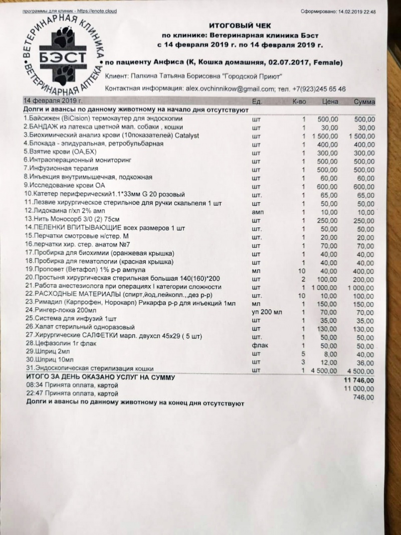 Мы готовим ее потихоньку с стерилизации. Е.М. настаивает на лапараскопии. Мы в замешательстве, но он рекомендует именно этот способ, более щадящий в ее случае. Мы должны думать о здоровье кошки несомненно. Но сумма озвучена 8 тыс операция и анализы ( это отдельная сумма) , мы должны перед операцией сделать снимок обязательно и сдать стандартные биохимию и общий анализ крови.
