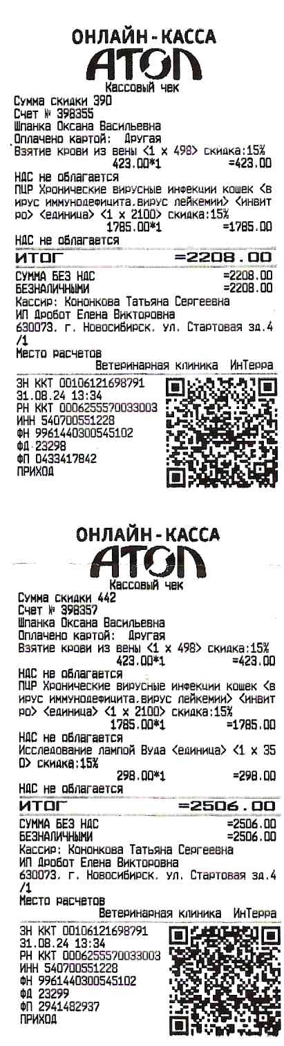 – Приём котят в клинике Интерра ул.Стартовая 4/1(ЦПР ДНК+иммунодефицит + лампа Вуда) – 2208.00ք + 2506.00ք=4714.00ք [чек№156] Итого расход: 8405.00ք
