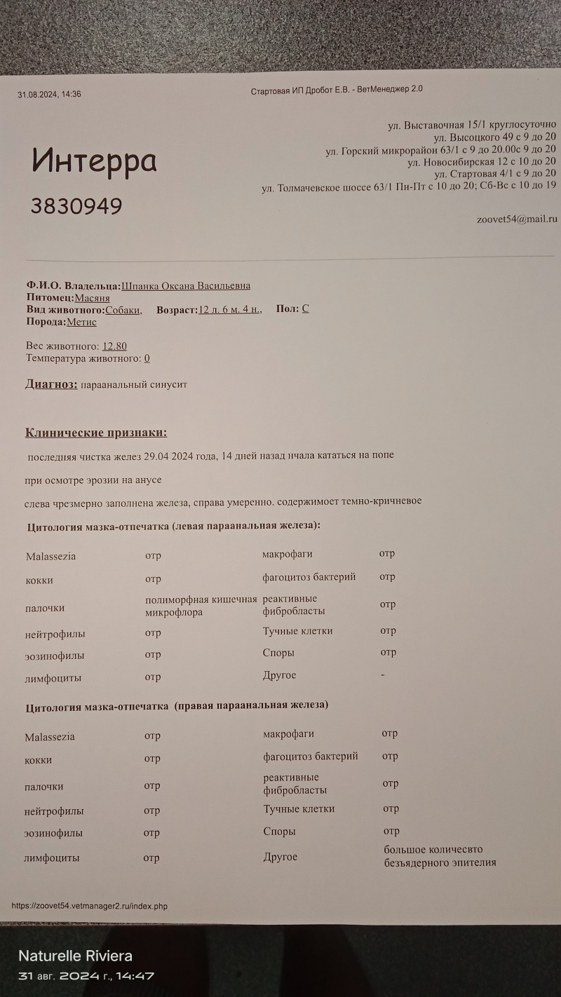 Возили вчера Масяну в клинику, задержали мы чистку, надо было пораньше хоть на месяц приезжать, содержимого было много в левой железе, она проблемная была. В правой нормально, цитология хорошая.