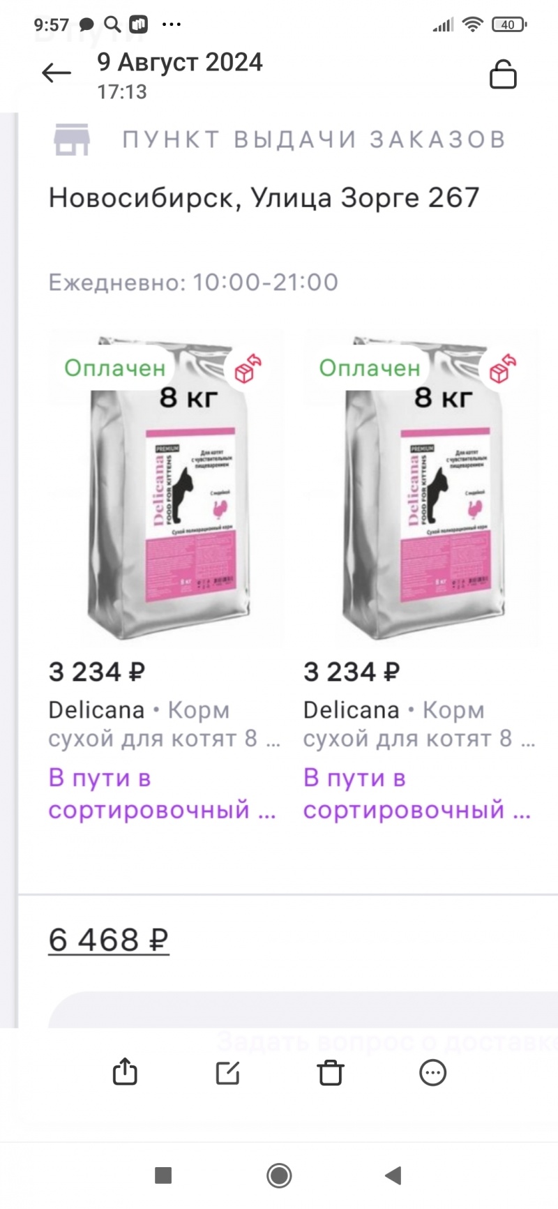 Заказала 2 мешка корм Деликана Индейка. Заказала для котят, он был по акции и дешевле, и котям с проблемами во рту его есть проще. А с проблемами во рту кошек большинство