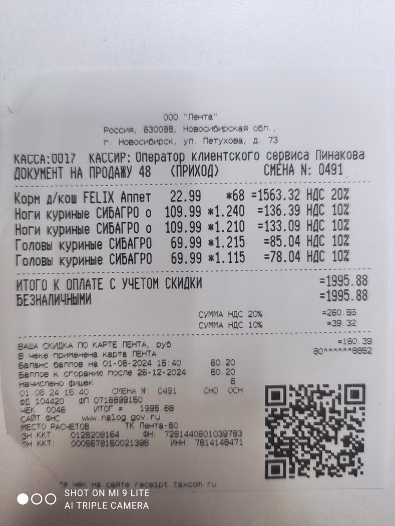 5. Корм для кошек паучи " Феликс ", ноги куриные, головы куриные на общую сумму: 1,995руб.