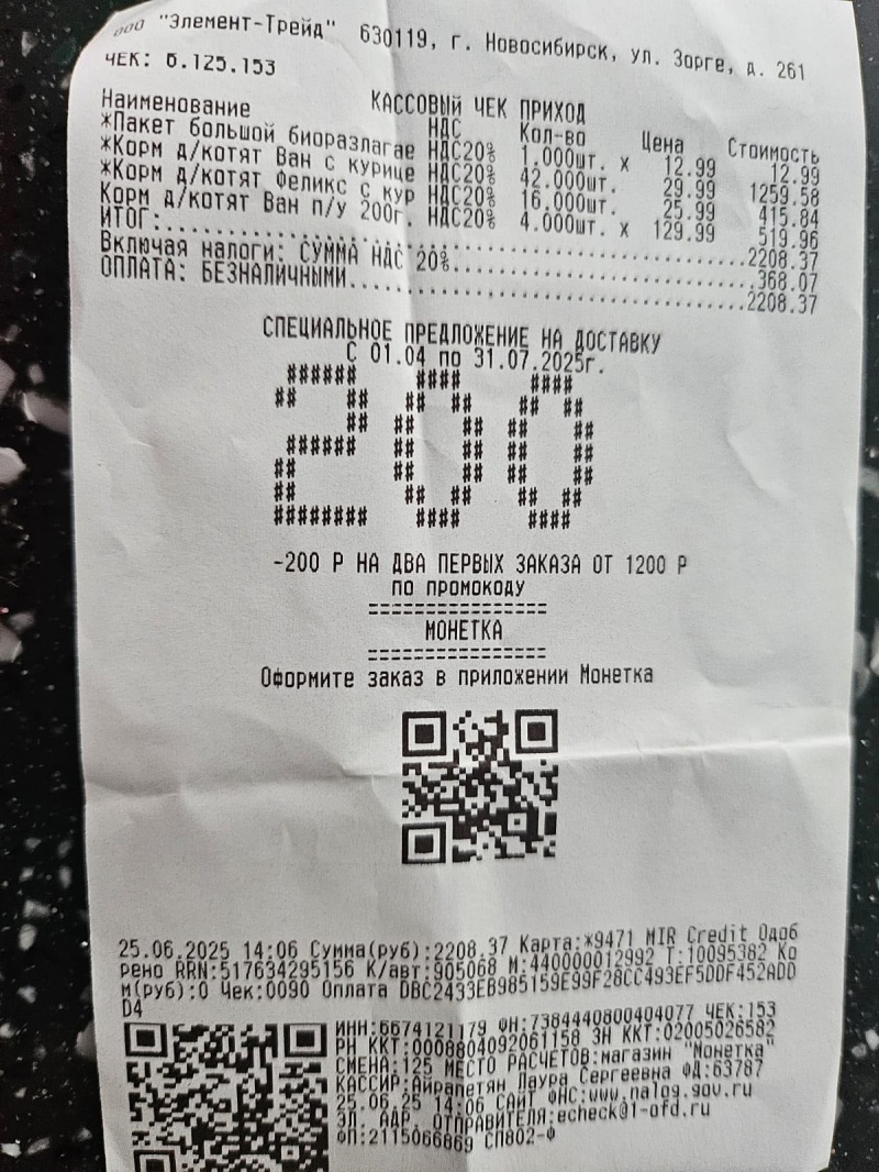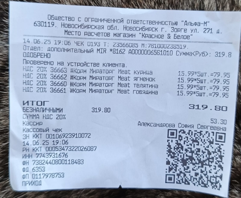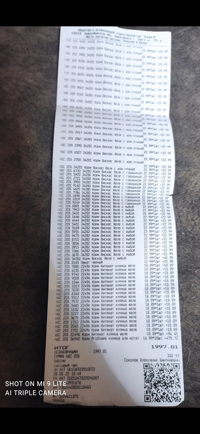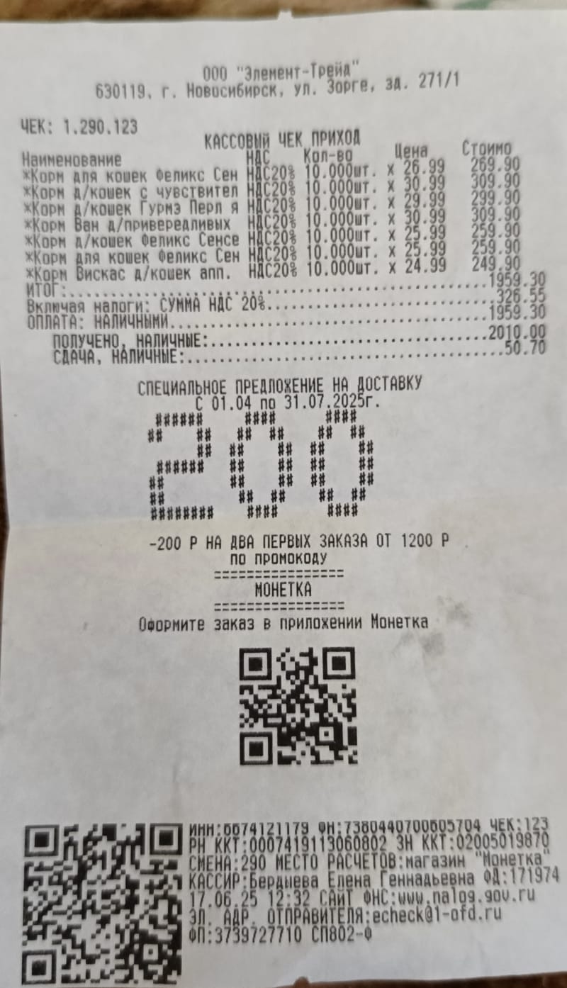 1. Корм для кошек паучи на общую сумму: 459руб.