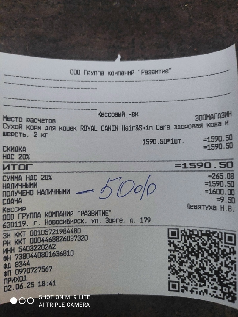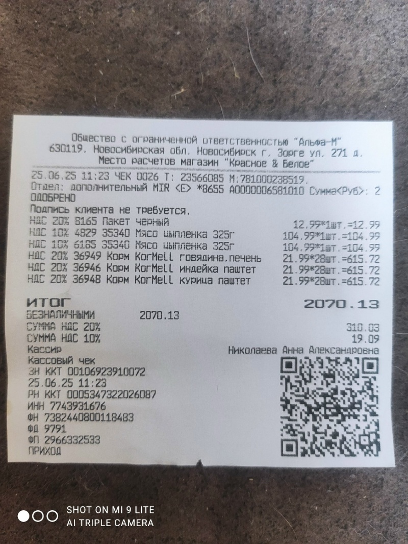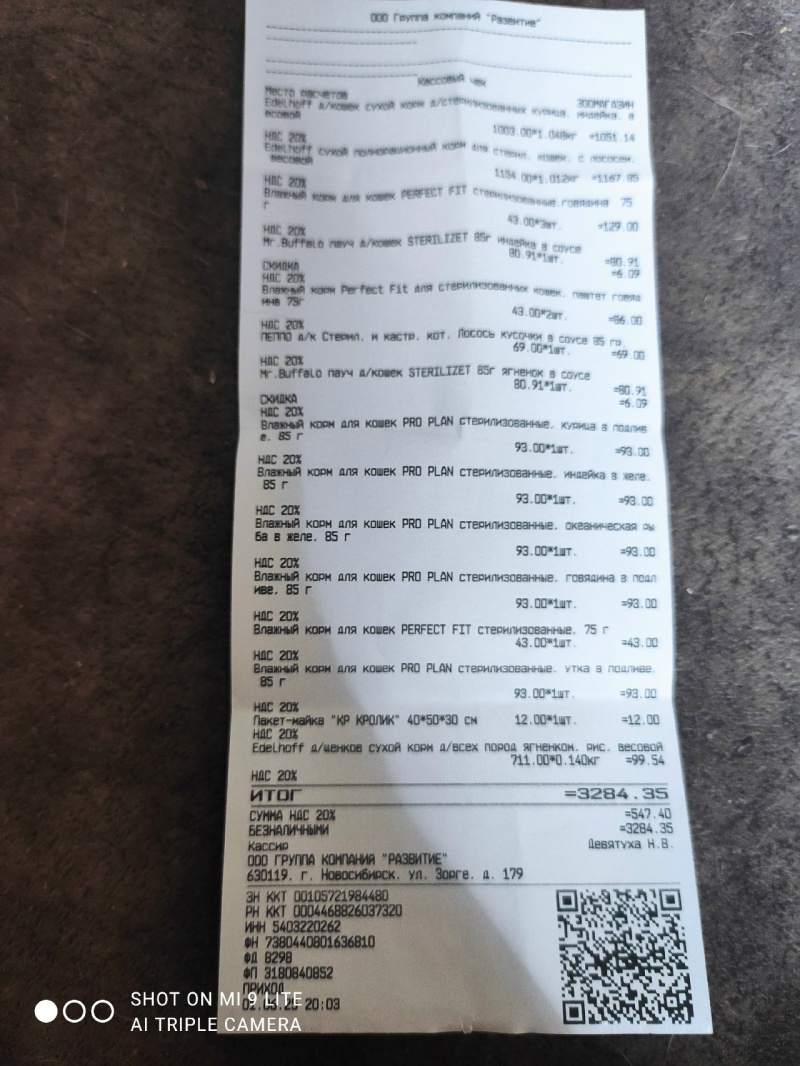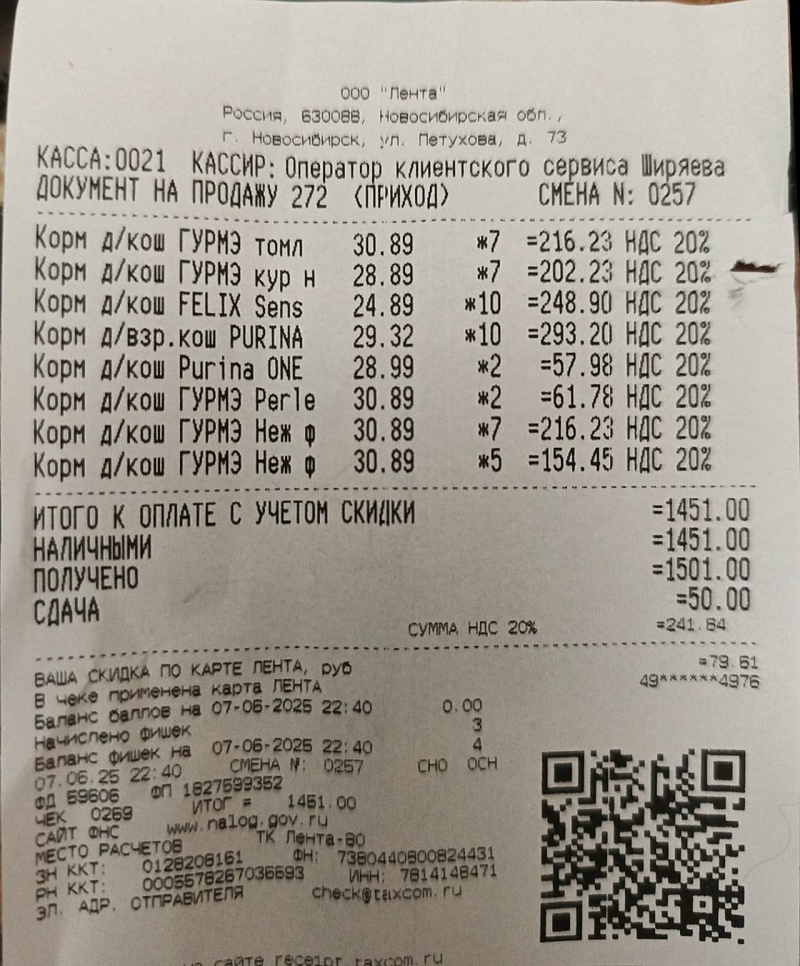 1. Корм для кошек паучи на общую сумму: 459руб.
