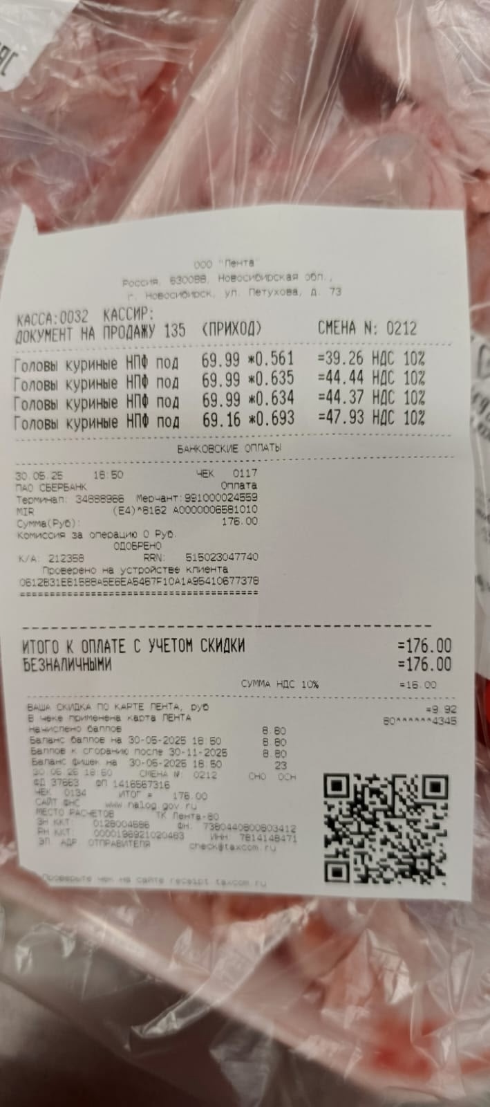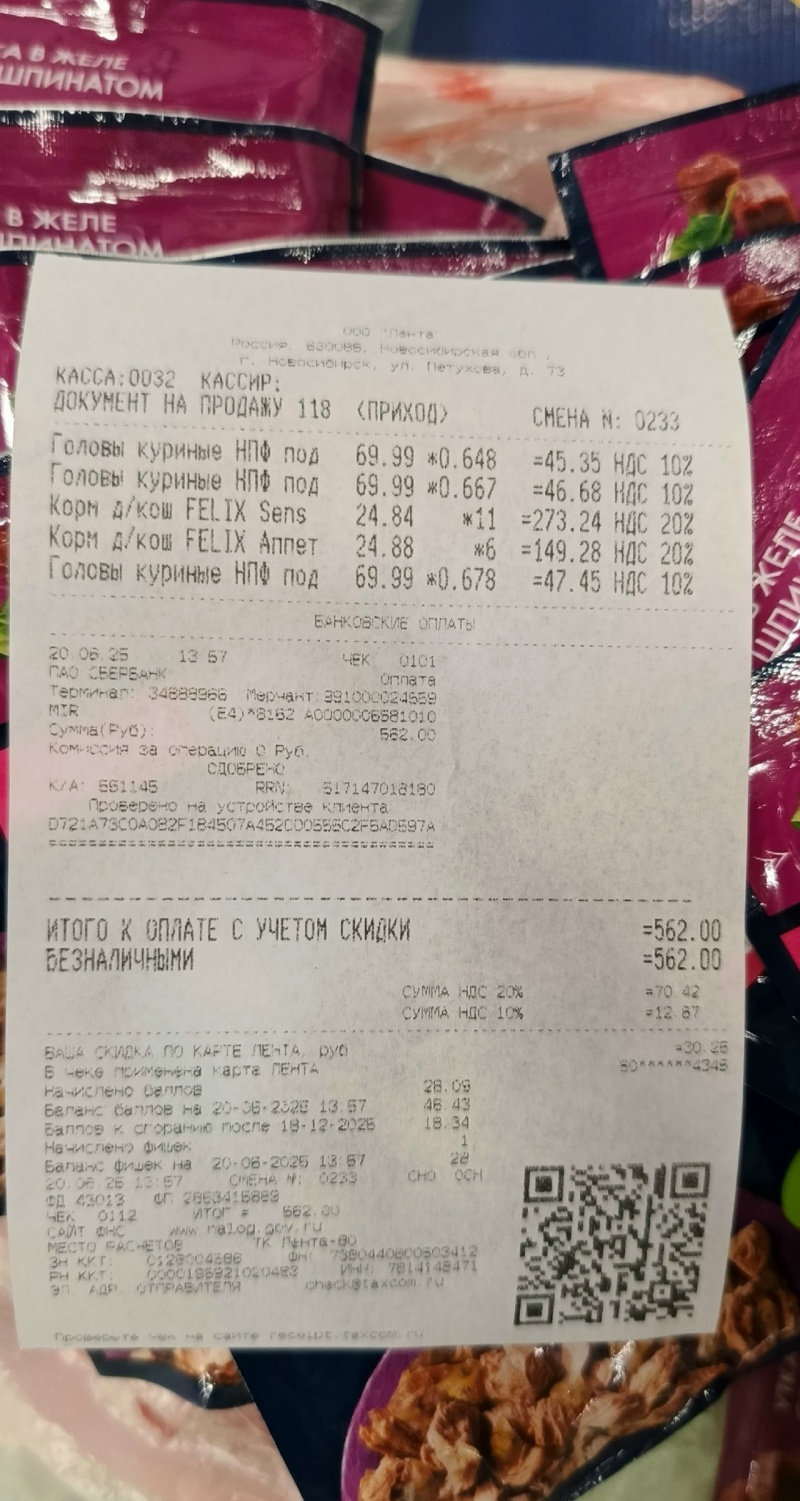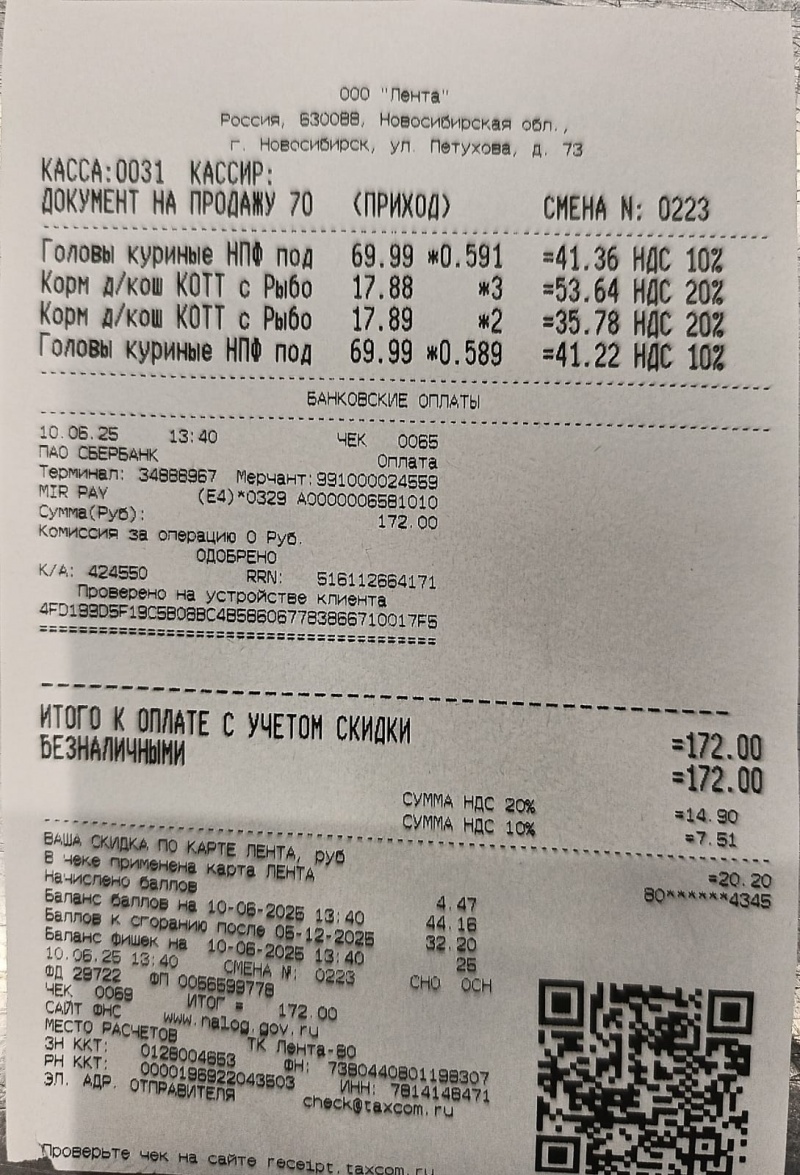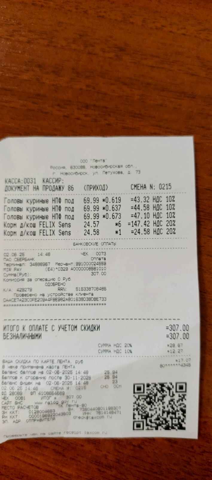 10. Головы куриные + корм для кошек паучи " Феликс " на общую сумму: 307руб.