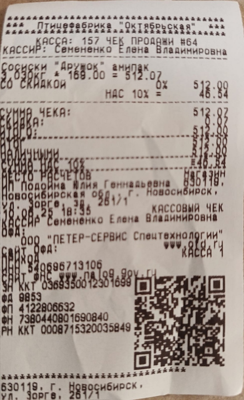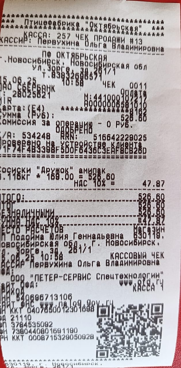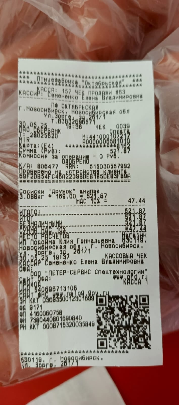 7. Сосиски для животных " Дружок " на общую сумму: 521руб.