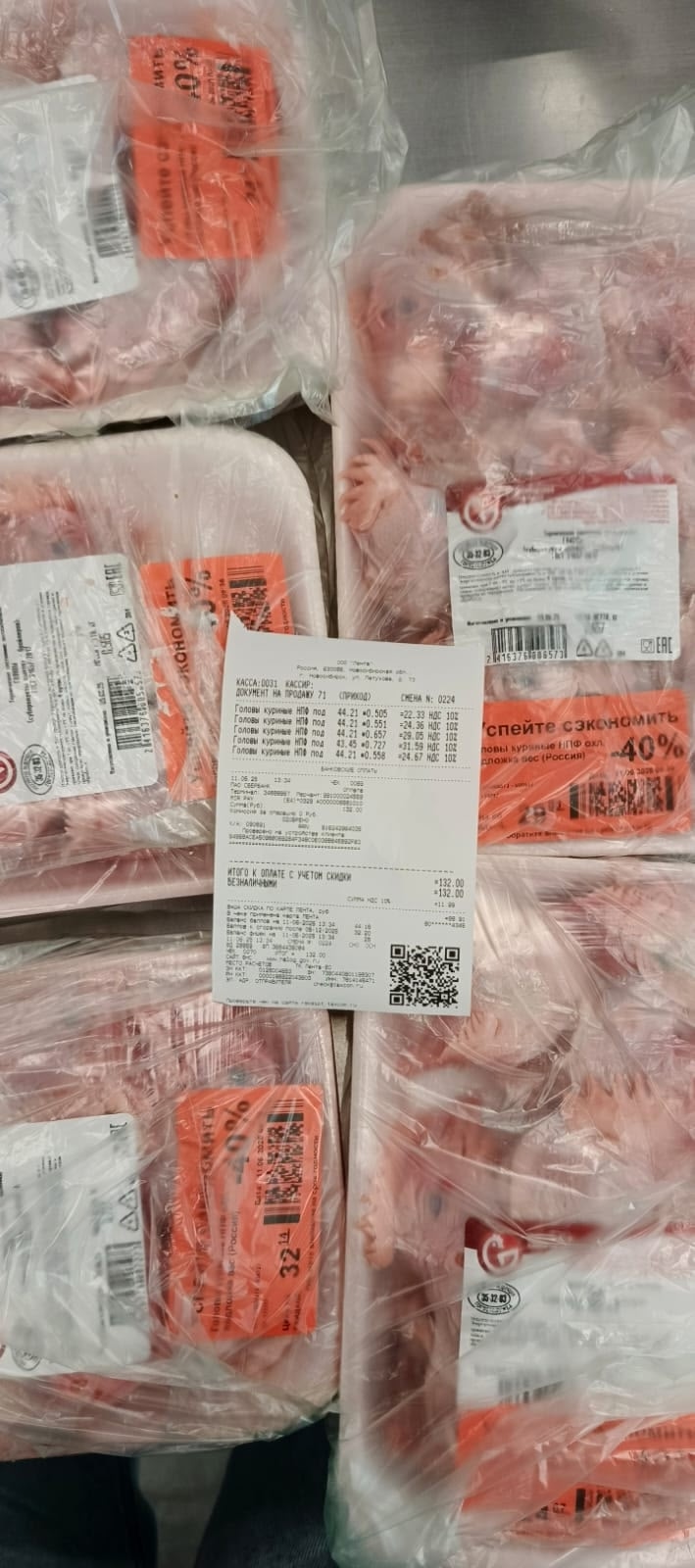 12. Головы куриные + корм для кошек паучи " Феликс " на общую сумму: 265руб.
