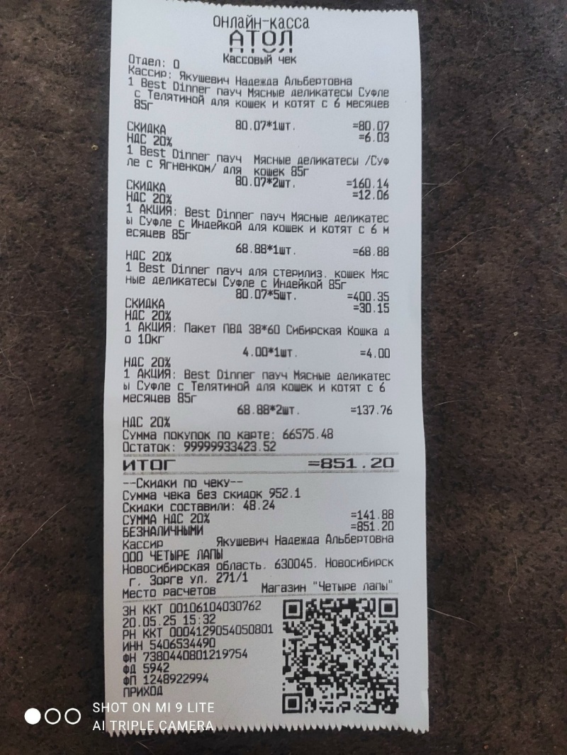 5. Корм для кошек паучи на общую сумму: 851руб.