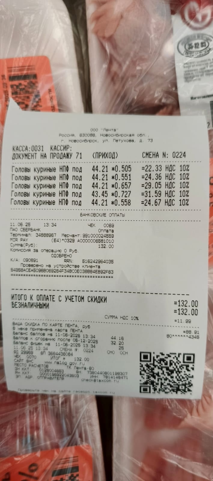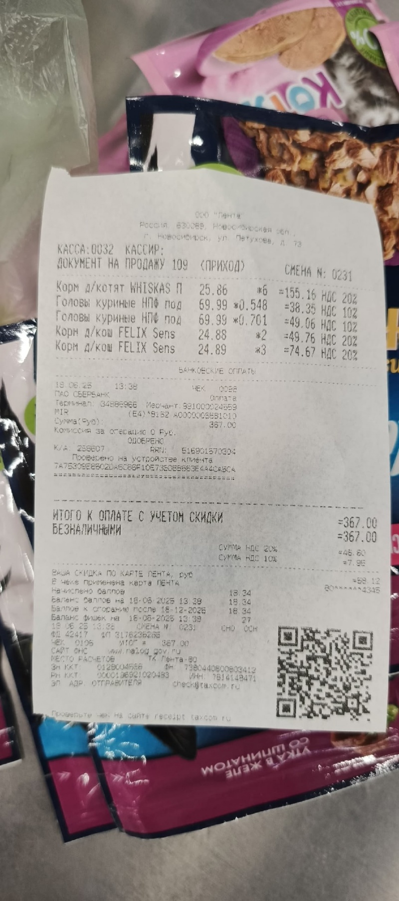 9. Головы куриные + паучи для котят и кошек " Вискас " на общую сумму: 343руб.