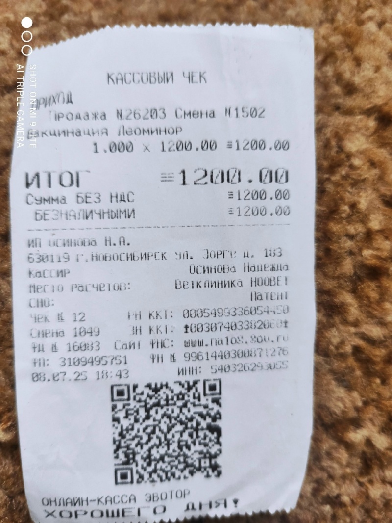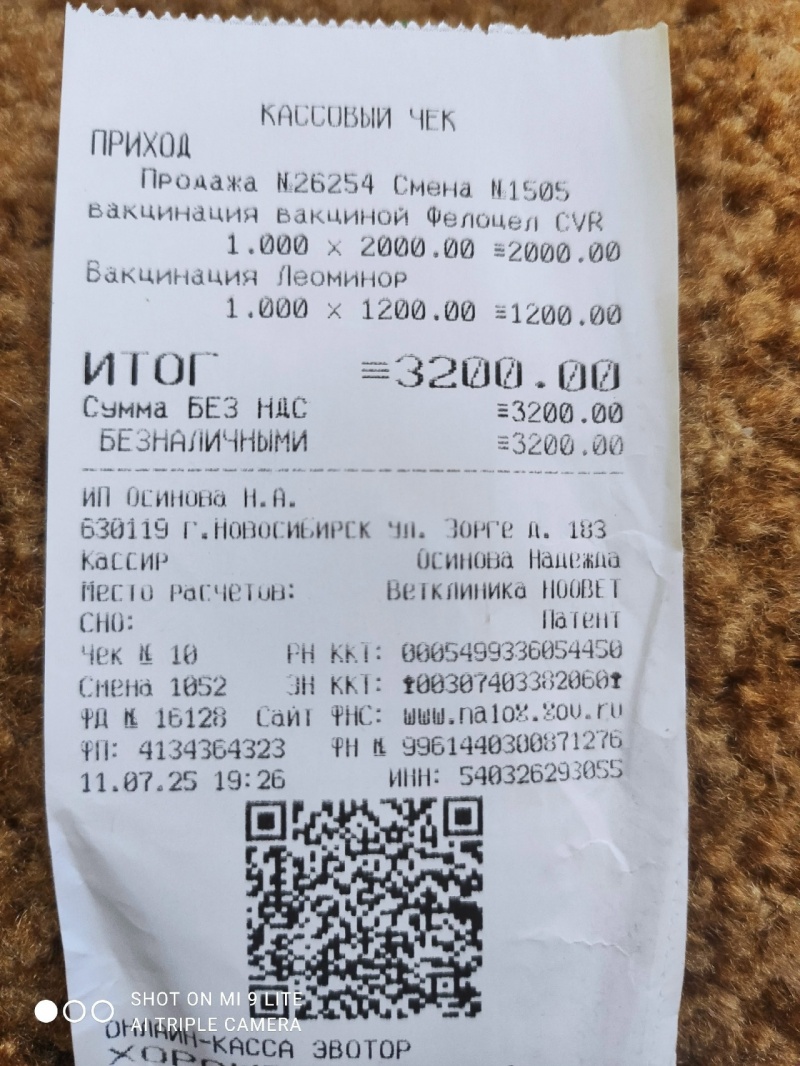 2. Вакцинация котика Пингвина в ветеринарной клинике на общую сумму: 1,200руб.