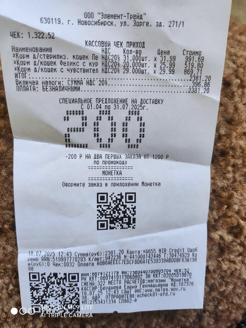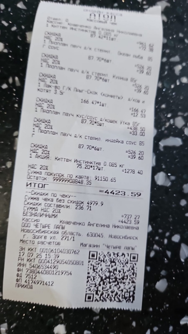 1. Корм для кошек паучи на общую сумму: 4,423руб.