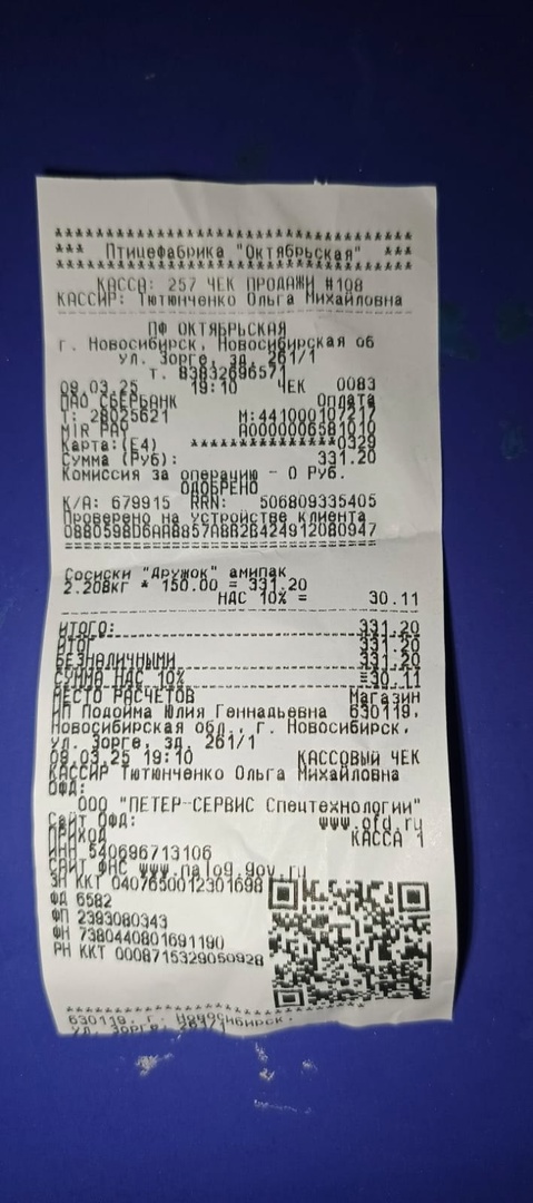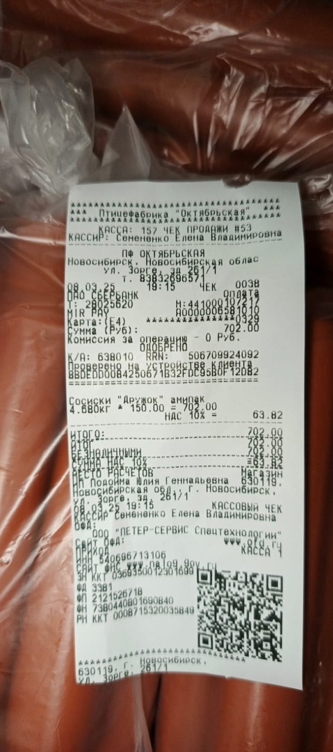 2. Сосиски ДРУЖОК для животных на общую сумму: 702руб. ( 08.03.2025г. )