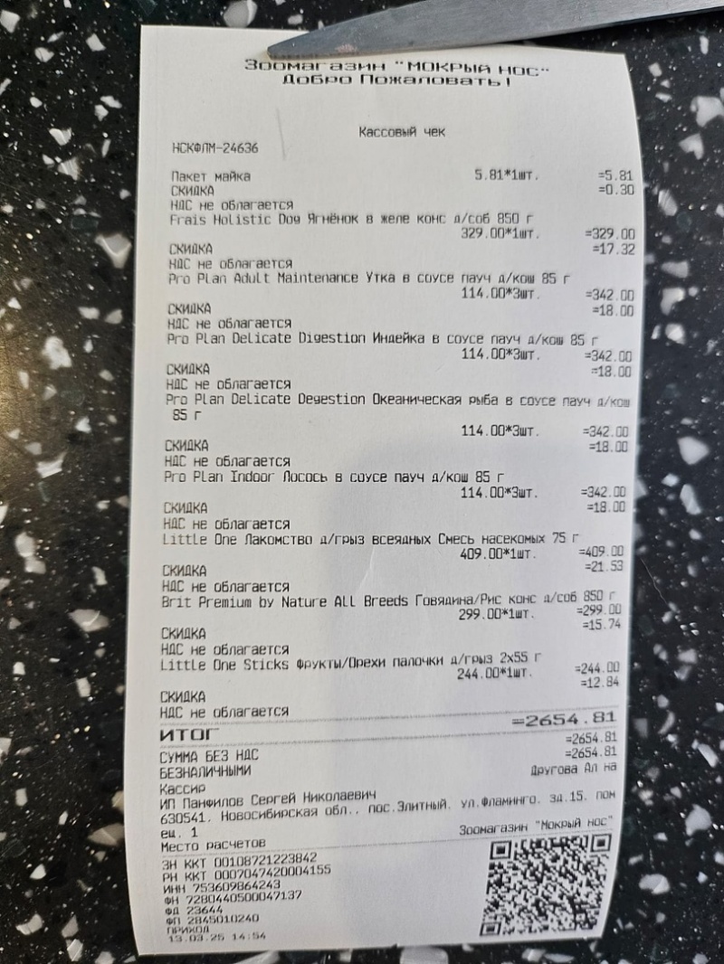 7. Корм для кошек паучи, консервы на общую сумму: 2,654руб. ( 13.03.2025г. )