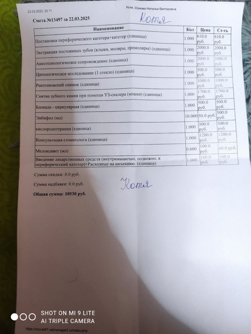 1. Ветеринарные услуги котика Коти на общую сумму: 10,530руб. ( 22.03.2025г. )