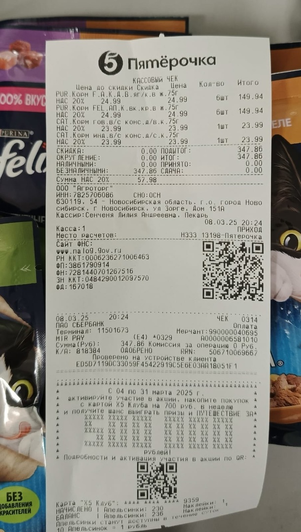 6. Корм для кошек паучи ФЕЛИКС, ВИСКАС на общую сумму: 823руб. ( 09.03.2025г. )