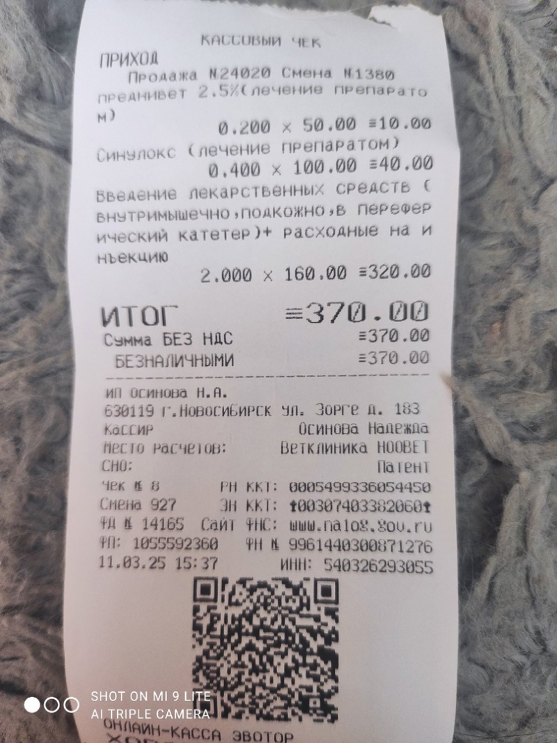 9. Ветеринарные услуги кошечки Розочки на общую сумму: 370руб. ( 11.03.2025г. )