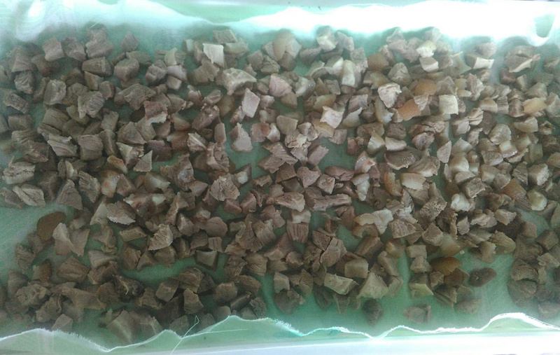 Все майские праздники мы ходили гуляли каждый день по 2-4 часа, во время прогулки кормлю мясными вкусняшками (мясо варю, режу и сушу), после прогулки ест мясную кашу (рис, гречка + мясо или консервы) на этом же мясном бульоне и грызет мясное (шеи куриные, лытки, рульки, рёбра говяжьи). Активно откармливаю его и мышцы наращиваем. Мне кажется, он уже стал толще, во всяком случае, животик у него теперь нормальный, а не прилипший к спине. Хотя он конечно еще дистрофан - все думают, что он щенок рахитный, т.к. от Клайда одна голова осталась. Но он набирает потихоньку, это хорошо.