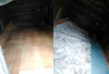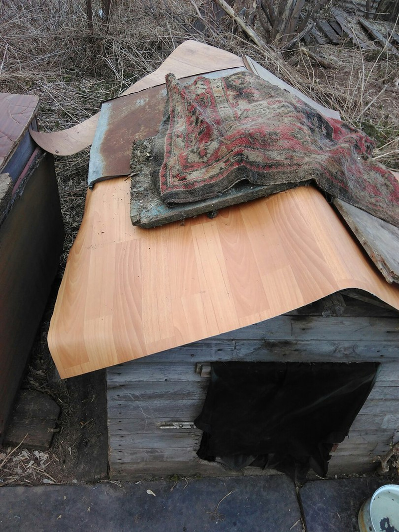 Будку ему накрыла линолеумом, прижала пока всяким хламом, нужно прибить его. Внутри тоже линолеум постелила и коврики. стенки тоже хочу оббить чем-нибудь, они совсем дырявые, много щелей, с левой стороны доска трухлявая выломана. Одна доска крыши провалилась внутрь, я ее отковыряла, воткнула другую и все застелила сверху линолеумом. Вовремя будку накрыла, т.к. в этот же вечер начался сильный дождь и шел всю ночь.
