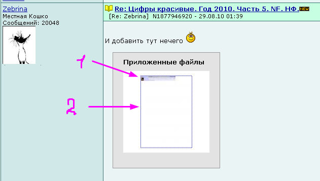 . А именно - размеры рисунка в Пэйнте. "Рисунок" - "Атрибуты" - сделать, например, 600х200. А то содержательная часть (1) теряется в пустыне (2), да еще форум все ужимает