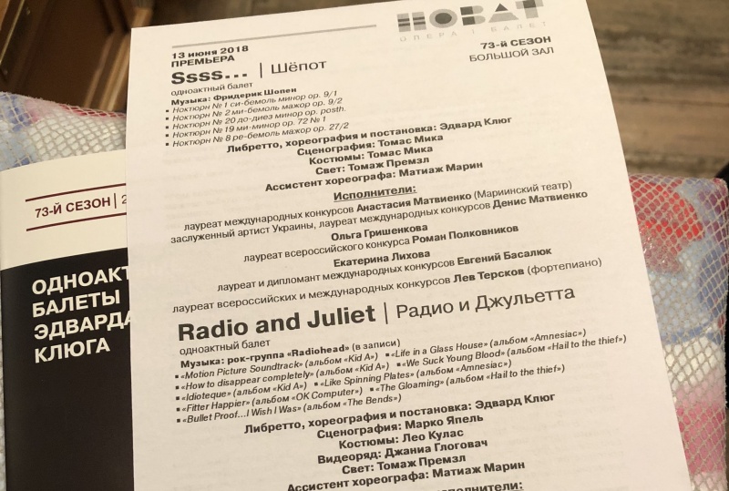 Декораций нет, голый минимализм, в первом балете "Шепот" три пары - три девушки и три парня, а в "Радио и Джульетте" шестеро мужчин и одна девушка - солистка из Мариинки.
