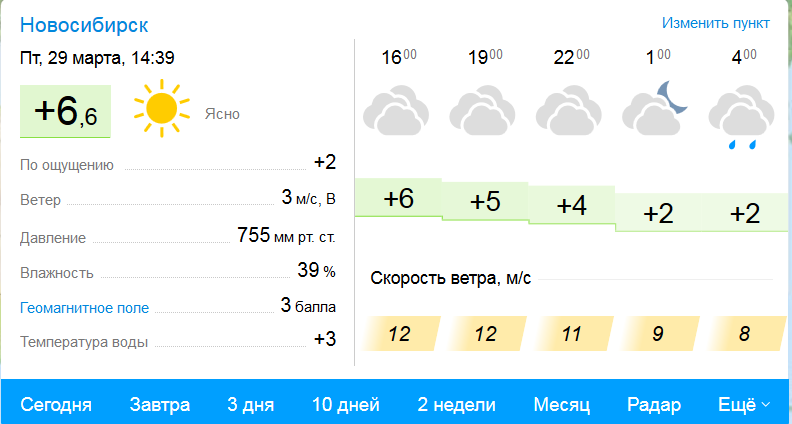Ну в итоге получилось среднее арифметическое, думаю, можно доверять Данные автоматической метеостанции НГС, г. Новосибирск, ул. Ленина, д. 12. Обновлено в 14:39