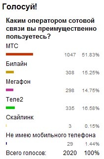 Везде тенденция одна: мтс все на первом месте, но теряет свои позиции, а т2 стремительно набирает обороты!Занимательная вещь - голосования. Пристально слежу за голосовалкой на news.ngs.ru. В рабочее время Билайн плелся в конце с 800+ голосами, уступая только Скайлинку. А сейчас вырвался на 2 место, за 3 часа нерабочего времени набрав 600 с лишним голосов. Такое впечатление, что все сотрудники Билайна пошли домой и проголосовали за свою компанию, либо кто-то накручивает рейтинг. Не может быть такого, что за 3 часа за одного оператора отдали голос сразу 10% всех проголосовавших за 48 часов. Специально сделал скриншот страницы НГС в 17-30... В общем, одни исследования сомнительные заказывают, другие рейтинг накручивают. Весело живем.