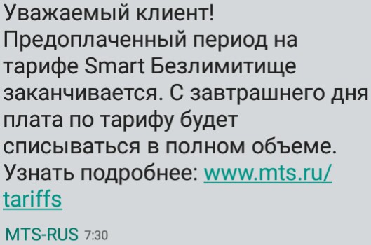 Данное информирование оповещает о переходе на ежесуточную плату.А почему с задержкой в ~3 недели? Ведь я перешел на ежесуточное списание с 01.07, а СМСка пришла 19-го.