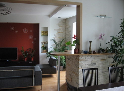 Телевизор можно разместить на кронштейне на стене, тогда появляется возможность смотреть его из-за стола, и удобнее будет глядеть с диване и банкетки (но это на любителя