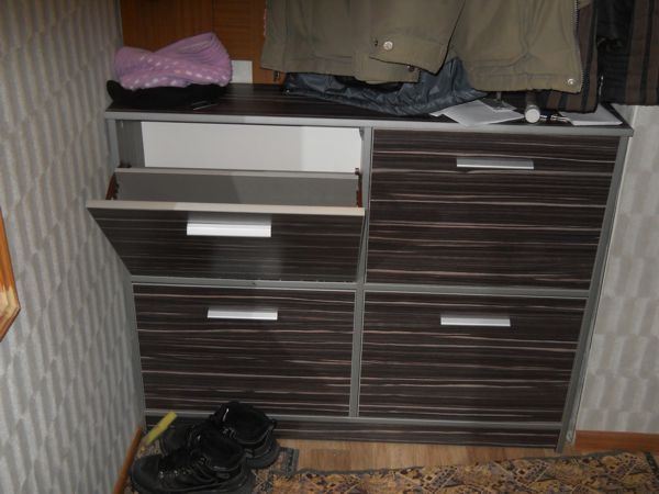 Шкаф можно купить в комплекте с вешалкой с полкой (93*91*29 см, 150 руб.) и вместительной тумбой (90*70*45см, 150 руб.)., в которой можно хранить обувь, шарфики, перчатки и проч. Изначально все продавалось именно в комплекте.