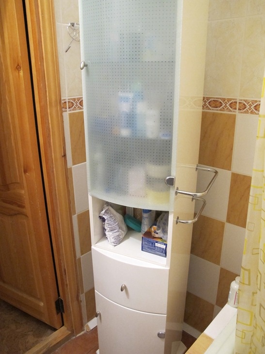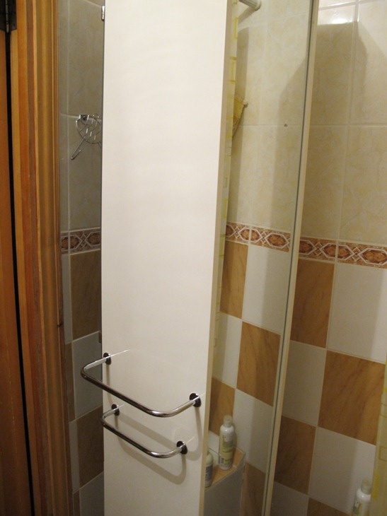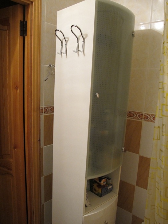 Шкаф вращается вокруг своей оси! На задней стенке - зеркало во всю высоту, супер-удобно! На боковых стенках - вешалки для полотенец и халатов.