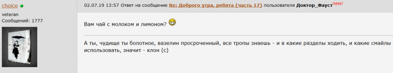 А ты, чудище ты болотное, вазелин просроченный, все тропы знаешь - и в какие разделы ходить, и какие смайлы использовать, значит - клон (с)