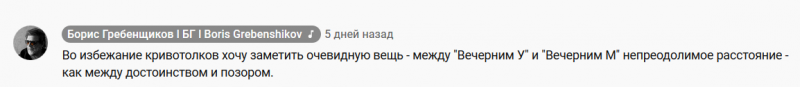 Как раз БГ и показал что стоит этот соловьиный помет на первом канале."соловьинный помет" это тоже перл Вани Урганта. Соловьев тогда тоже бесился, может поэтому его перевод стрелок из-за песни БГ на Урганта выглядел особо глупым и нелепым. Но Ваня хорошо отреагировал, тонко.