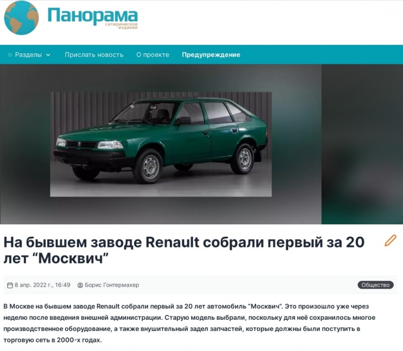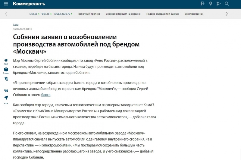Выпуск электромобилей «Москвич» отложен до восстановления поставок карбюраторов – СобянинА жизнь длиннее не становится, и чё нам делать - застрелиться?