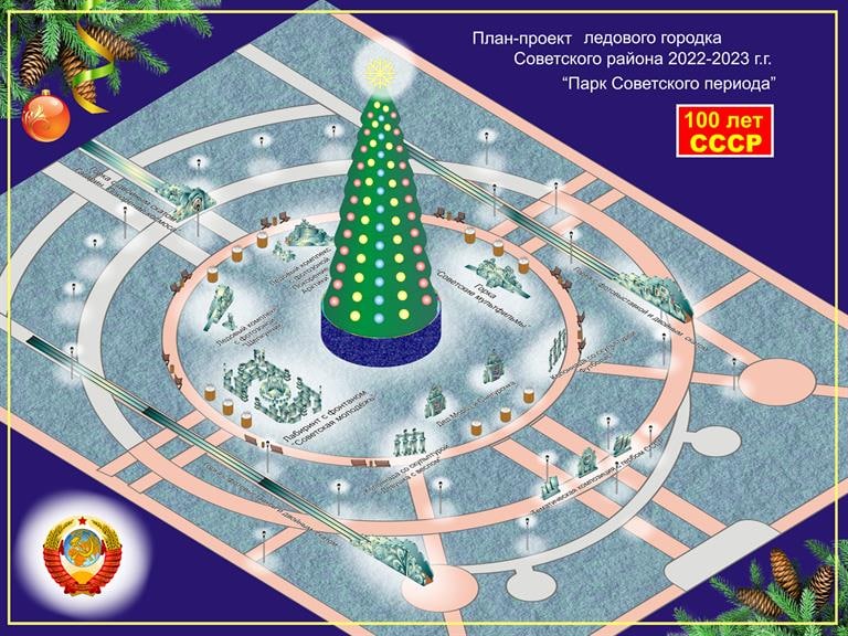 Администрация Советского района города объявила (https://vk.com/wall-131586346_3440), что один из ледовых городков будет посвящен 100-летию со дня образования СССР: в центре будет расположен герб Советского Союза, развешаны знамёна и расставлены колоннады со скульптурами «Девушка с веслом» и «Футболист»; будет работать лабиринт «Советская молодежь», а на одной из горок будет портрет Юрия Гагарина