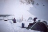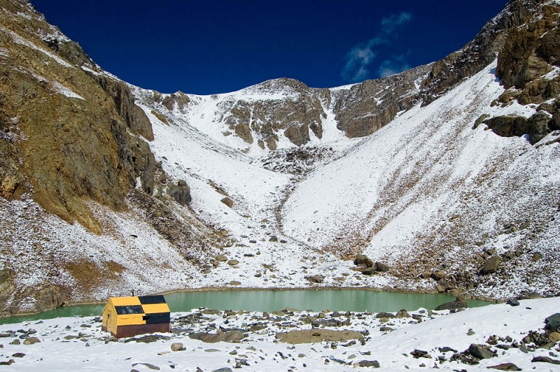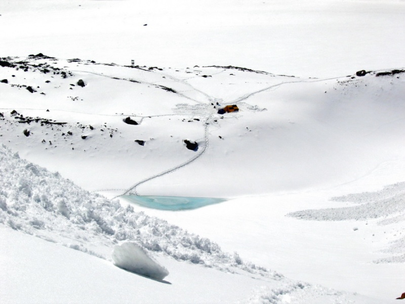 В прошлом году мы там с неделю жили, начиная с 25 июня. Ходили на Кызылташ, Актру, Стажеров. Снег никуда не уходил, а в ночь на 30 вода ушла сантиметров на 20, было около - 10 и озеро замерзло, утром чтобы воды набрать приходилось разбивать достаточно крепкую корку льда. Ну и снег шел практически каждую ночь.