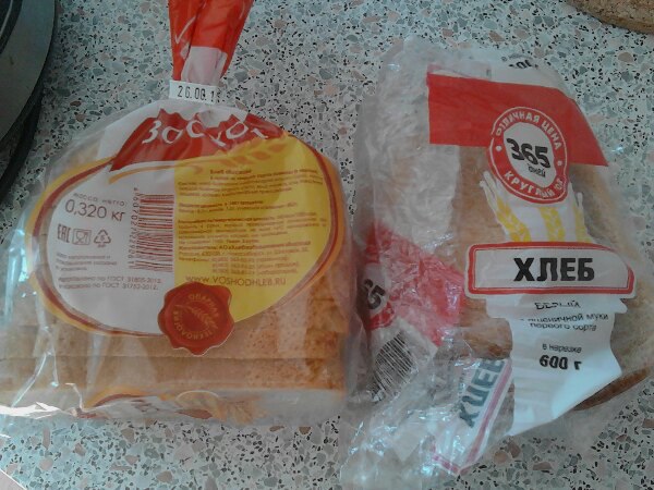 • Дяденька tolstopuz, я прекрасно ем хлеб изготовленный по ГОСТ 31805-2012, ГОСТ 26987-86 и нарезанный и упакованный по ГОСТ 31752-2012, не с перепоя и не с голодухи. Цена булки 600 грамм Хлебокомбинат Инской 1с = 17,09 руб. (Лента), полбулки 320 грамм Хлебообъединение Восход = 11,40 руб. (Холидей)