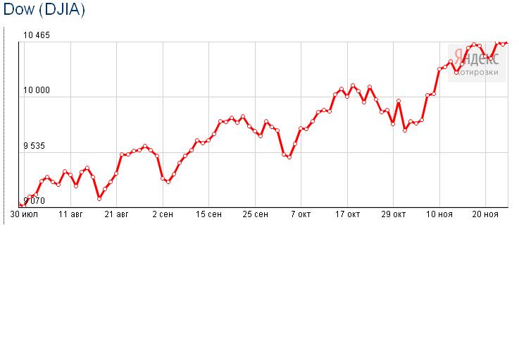 Вот график динамики индекса Доу-Джонса (см. прикреплённую картинку) начиная с июля. Остальные мировые показатели - соответствующие индексы других развитых стран, Наждак, эсэндпи500, курсы евродоллар и прочее в таком духе - весьма схожи. Индексы колониальной экономики РФ можно не учитывать и даже послать.......