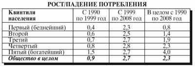 Заберете Вы у абрашек, берез и ходоров все и станете вмиг жить лучше?Я уже приводил статистику, что в за 2000-е годы потребление всех слоев населения России выросло более чем в 2 раза, в то время как за 1990-е оно упало примерно у 80 % более бедного населения, но у 20 % - выросло. Полагаю, что если бы ВВП не занялся березами, ходорами и прочими гусями-лебедями, то олигархи вряд ли добровольно захотели бы поделиться сверхприбылями от подорожавшей нефти с народом.