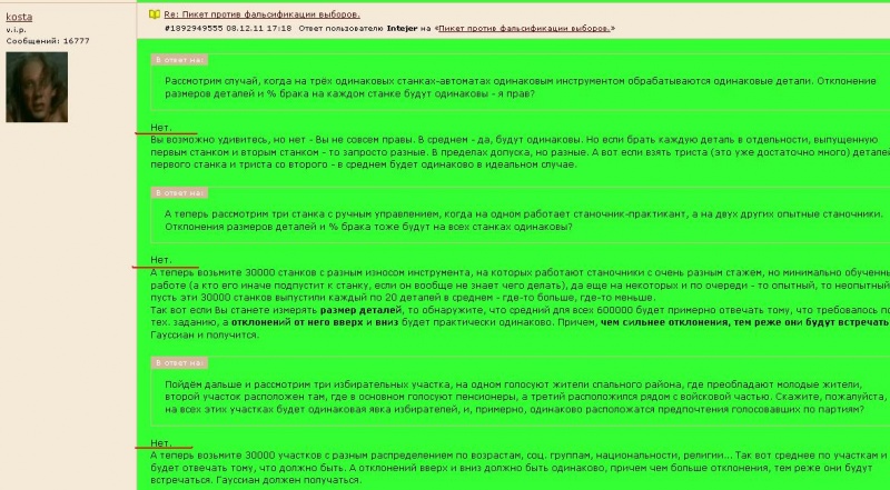 В ответ на: И давайте не будем уходить от ответа: Вы считаете, что в случае с тремя участками, которые я описал, на каждом и явка и распределение голосов будут одинаковы, или признаёте, что возможны значительные отклонения?
