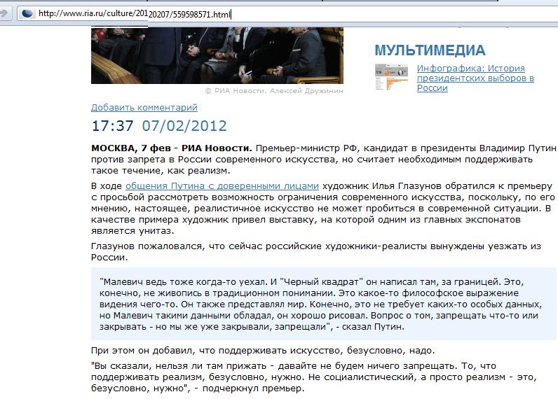 А тут такое "открытие". "Малевич ведь тоже когда-то уехал. И "Черный квадрат" он написал там, за границей" ВВПутин. . web-страница Если ссылку похерят - скан прилагаю.