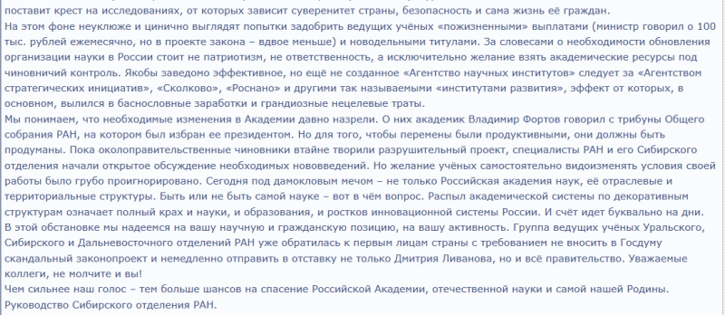 У меня лично никаких тёплых чувств в научной бюрократии нет. Например, когда-то давно мне с женой не дали объединить жилплощадь в Академгородке. Я нашёл после нескольких лет обменов ПЯТЕРНОЙ вариант. Всё было нормально. Но переехать на Золотодолинскую не дали. ЕДИНСТВЕННАЯ причина - моя жена работала в МЕДакадемии, а не в СОРАН. Физиономии запрещающих светились радостью - человек хотел жить в Академе, а они - не дали. Показывали "закон" об особом статусе и радостно сообщали, что судиться бесполезно.
