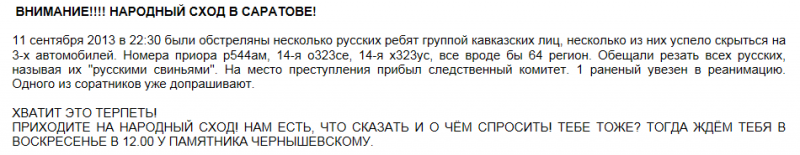 В Саратове произошла массовая драка кавказцев с русскими патриотами. -сайт Четвёртая власть В Саратове планируется Народный сход 15 сентября 2013г (см. скрин).