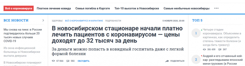 Мнение по этому поводу: В новосибирском подразделении ФМБА, которым рулит экс-глава Минздрава РФ Вероника Скворцова, за коммерческое лечение от ковида берут до 32 тыс. руб. в сутки. В цену входит наблюдение, трехразовое питание, лекарства, расходные материалы и диагностика. Отдельно доплатить придется за тесты ПЦР на коронавирус, КТ, госпитализацию и реанимацию.