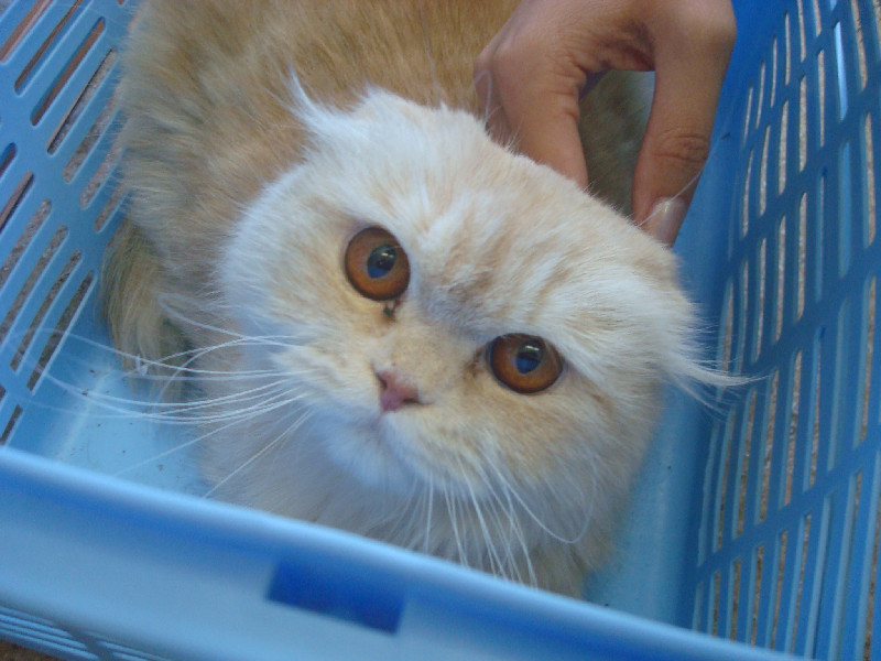 Большой, светло-рыжий кот(или кошка) с медными глазами, плоской мордой, прижатыми ушками.