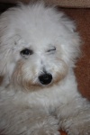 Потерялась собака, похожая на болонку или белого пуделя (порода Бишон ФРИЗЕ). Кобель, собака пугливая, больная, требует операции и медицинского ухода!!! С клеймом!!!