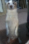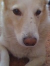 Бело кремовая окраска ,не высокий ,передние лапы кривые,левый глаз меньше и не видит, на нижней челюсти с права нет нескольких передних зубов ,шрамы на мордочке.