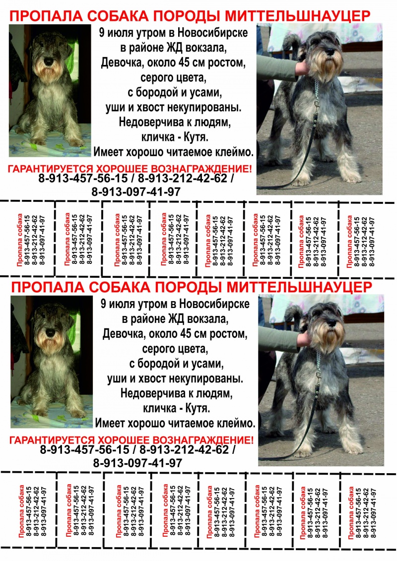 Девочка, около 45 см ростом, серого цвета, с бородой и усами, уши и хвост некупированы. Недоверчива к людям, кличка - Кутя. Имеет хорошо читаемое клеймо.