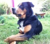 Собака трехцветная: черная, с рыжими подпалинами на лапах и белым крестом на груди.